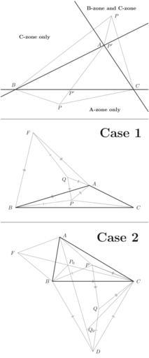 | Keywords: Fermat Point Scope.svg en A purely geometric treatment of the Fermat point own MRFS 2008-08-31 fermat proof png Source The main reason for this diagram is to emphasise that the Fermat point is NOT the same as the first isogonic center which is unfortunately a very widespread misconception The source is licensed under the same license as the image Feel free to edit fix or improve it fermat_point_scope euk <pre> Combination of 3 figures in 1 box 0 0 10 24 draw segment point 0 9 point 10 9 draw segment point 0 16 point 10 16 Proof that the Fermat point lies within the triangle A point 7 21 B point 1 18 C point 9 18 D point 4 17 E point 7 5 23 thickness 2 draw line B C draw line A B draw line A C thickness 0 5 draw segment D A draw segment D B draw segment D C draw segment E A draw segment E B draw segment E C label A 0 2 170 label B 0 2 110 label C 0 2 45 draw P' intersection line A D line B C 0 1 280 draw P D 0 1 270 draw \textbf A-zone only D 2 350 draw P' A 0 2 355 draw P E 0 2 0 draw \textbf B-zone and C-zone E 0 4 90 draw \textbf C-zone only segment A B 2 120 Case 1 - an angle at least 120 degrees H point 6 11 5 I point 1 10 J point 9 10 K point 4 8 10 5 I H F equilateral K H G equilateral thickness 2 draw H I J thickness 0 5 draw H K G draw segment F H draw segment F I draw segment F G draw segment K I draw segment K J draw A H 0 2 20 draw B I 0 2 180 draw C J 0 2 0 draw P K 0 1 270 draw Q G 0 1 210 draw F F 0 2 180 draw \textbf \Huge Case 1 F 4 5 0 mark segment K I simple 0 7 mark segment G F simple 0 7 mark segment H K double 0 7 mark segment K G double 0 7 mark segment G H double 0 7 mark segment H I triple 0 7 mark segment I F triple 0 7 mark segment F H triple 0 7 Case 2 - no angle greater than 120 degrees L point 4 8 M point 3 5 5 N point 9 5 P point 6 2 6 1 M L O equilateral N P Q equilateral N M R equilateral S intersection line N O line L R N S T equilateral thickness 2 draw L M N thickness 0 5 draw N P Q draw segment M R draw segment N R draw segment O L draw segment O M draw segment R Q draw segment P L draw segment P N draw segment M P draw segment S M draw A L 0 2 20 draw B M 0 2 180 draw C N 0 2 0 draw P P 0 2 180 draw Q Q 0 1 180 draw F O 0 2 180 draw D R 0 2 0 draw P_0 S 0 1 45 draw Q_0 T 0 1 0 draw \textbf \Huge Case 2 L 2 5 0 draw segment L R draw segment N O draw segment N T mark segment M P simple 0 7 mark segment Q R simple 0 7 mark segment N P triple 0 7 mark segment N Q triple 0 7 mark segment P Q triple 0 7 mark segment M N double 0 7 mark segment M R double 0 7 mark segment N R double 0 7 </pre> Fermat point |