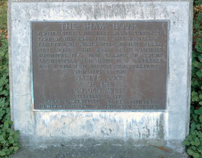 Keywords: Ferndale CA Shaw House NSGW.jpg en Photograph of historical marker at Main and Lewis Streets Ferndale California which reads The Shaw House - Pioneer Seth Louis Shaw began construction of his home Fern Dale in 1854 The town was named after his first permanent home The home in its original condition is a fine example of gothic architecture The house is a landmark and a source of pride to the community Dedicated by the Native Sons of the Golden West February 13 1982 Larry E Mowinckel Grand President In memory of James D Phelan U S Senator own photo Ellin Beltz 2012-10-26 40 34 43 7 N 124 15 42 18 W region US Plaques in Ferndale California Historical markers in Humboldt County California Taken with Panasonic Lumix DMC-FX12 Native Sons of the Golden WestPhotographs by Ellin Beltz |