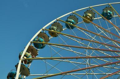 Keywords: ferris wheel year market fair ride folk festival carousel sky high gondolas leisure adrenaline huge thrill partly cloudy festival site carnies entertainment theme park pleasure turn hustle and bustle fairground fun action speed