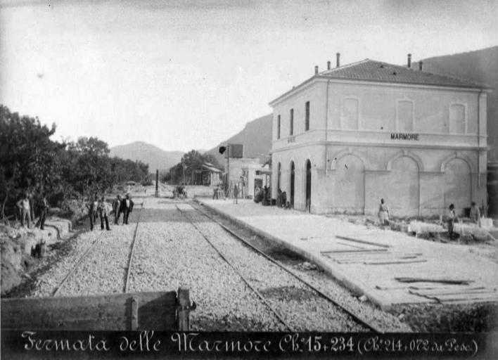 Keywords: Ferrovia Terni-Rieti-L'Aquila (1883) - stazione di Marmore.jpg it Fermata di Marmore Immagine tratta dalla raccolta di fotografie sulla costruenda ferrovia Terni-Rieti-L'Aquila realizzata da Achille Mauri per conto della Società Italiana per le strade ferrate meridionali e pubblicata nell'ottobre 1883 1883-10 https //www facebook com/photo php fbid 422050781295216 set a 118426424990988 24141 100004708923017 type 1 theater Mario Scardaoni Achille Mauri other versions PD-old-70-1923 Marmore train station |