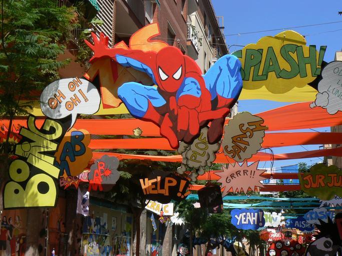 Keywords: Festes majors de Gràcia 2010 - carrer Bruniquer.jpg ca Carrer Bruniquer decorat amb el tema dels superherois i el comic amb motiu de les festes majors del barri de Gràcia a Barcelona de 2010 L'entrada al carrer anava pressidida per n'Spiderman l'home aranya own Slastic 2010 Decorated streets Festa Major de Gràcia 2010 Spider-Man and his cast Onomatopoeia |