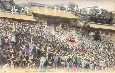 Keywords: Festival of Suwa Shrine.jpg en Festival of Suwa Shrine Nagasaki ja 長崎諏訪神社祭禮 手彩色絵葉書 www ehagaki-nagasaki com 長崎の手彩色絵葉書 明治 PD-Japan-oldphoto Postcards of Nagasaki Postcards of people in Japan 1900s postcards Suwa-jinja Nagasaki