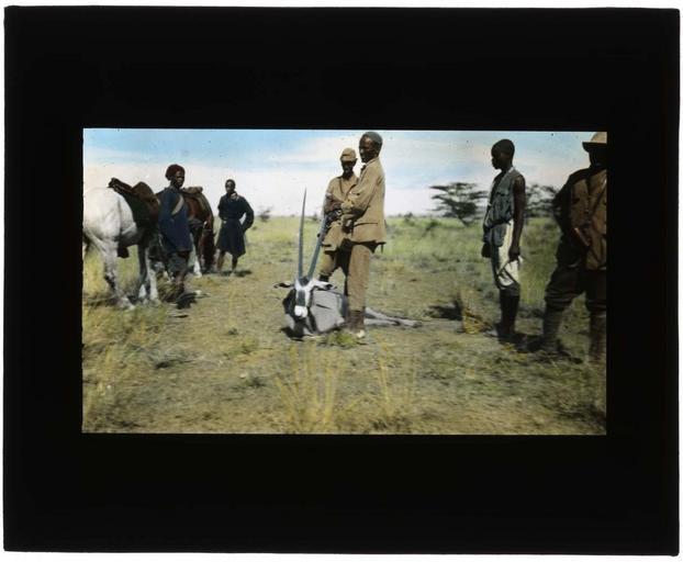 Keywords: gemsbock animal mammal specimen africa men horse equus horns animals mammals saddle cap hat savannah 1909 reesevelt expedition smithsonian american usa smithsonian institution smithsonianinstitution smithsonian institution archives smithsonianinstitutionarchives photo border outdoor Creator: Kermit Roosevelt or Edmund Heller Date: 1909 Local number: SIA2011-1414 Summary: Acc. 06-093 Box 1 Folder 2. From a hand-painted lantern slide documenting the Smithsonian-Roosevelt African Expedition of 1909. Repository: Smithsonian Institution Archives View more collections from the Smithsonian Institution. Creator: Kermit Roosevelt or Edmund Heller Date: 1909 Local number: SIA2011-1414 Summary: Acc. 06-093 Box 1 Folder 2. From a hand-painted lantern slide documenting the Smithsonian-Roosevelt African Expedition of 1909. Repository: Smithsonian Institution Archives View more collections from the Smithsonian Institution.