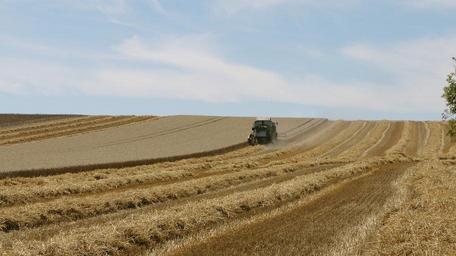 Keywords: field landscape sky agriculture harvest grass rural blue hay haying harvester thresher cereals work in the fields