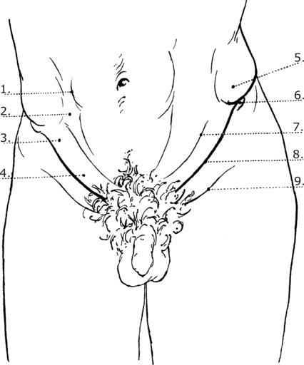 | Keywords: Fig24aDasRumpfende eines stehendenMannes.png Fig 24a Das Rumpfende eines stehenden Mannes von vorn mit Bauchlinie Leistinie und Schenkelbeugungsfurche Siehe Fig 24b KOLLMANNs Plastische Anatomie page 44 1910 Anschütz PD Image Fig24bRumpf_von_vornNach_einerPhotographie png PD-old 1 Rectus; 2 Seitenfurche; 3 Aponeurose; 4 Samenstang; 5 Muskelecke; 6 Spina; 7 Untere Bauchlinie; 8 Leistenlinie; 9 Schenkelbeugungsfurche Flaccid human penis in art Kollmann - Plastische Anatomie Diagrams labelled with numbers only |