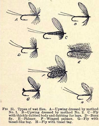 Keywords: Fig51FlyTyingDevices.JPG Fig 51-Types of Wet Flies from The Trout Fly Dresser's Cabinet of Devices 1919 Extracted from PDF version of above work on the Internet Archive 2008-03 Mike Cline PD-old Fly tying