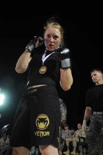 Keywords: Fight Night DVIDS202498.jpg en U S Army 1st Lt Serenity Nelson assigned to Alpha Company 3rd Brigade Special Troops Battalion displays her guard stance after winning a fight against her opponent during the Fight Night for Heroes a mixed martial arts fighting event at Forward Operating Base Marez near Mosul Iraq Sept 5 The event featured mostly active duty military members with 17 fights on the card and more than 1 000 Soldiers Sailors Airmen Marines and civilians in attendance 2009-09-05 Petty Officer 1st Class Carmichael Yepez https //www dvidshub net/image/202498 090905-N-+++++-156 2009-09-09 12 39 MOSUL IQ PD-USGov-Military-Navy Forward Operating Base Marez Images from DoD uploaded by Fæ |