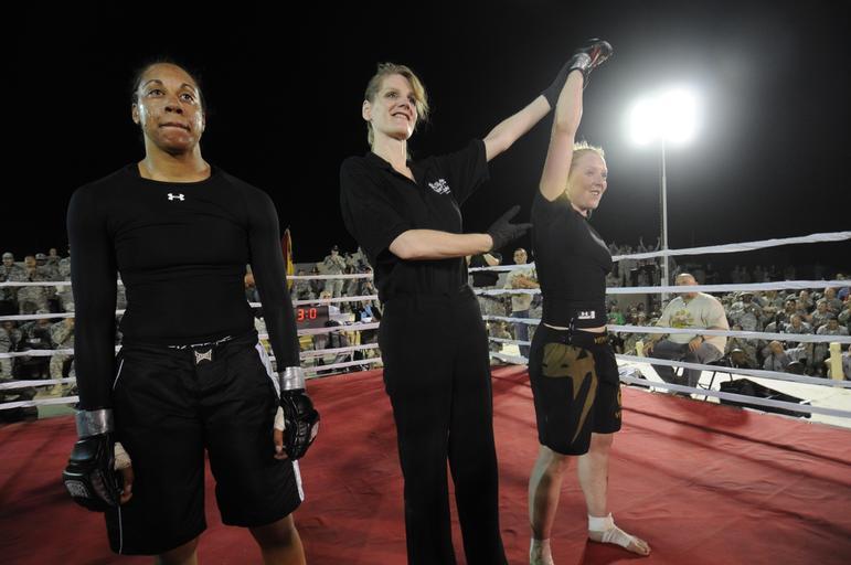 Keywords: Fight Night DVIDS202519.jpg en U S Army Sgt Maegan Stuart assigned to the 84th Engineering Battalion stands by as 1st Lt Serenity Nelson assigned to Alpha Company 3rd Brigade Special Troops Battalion is announced the winner of the mixed martial arts fight during Fight Night for Heroes at Forward Operating Base Marez near Mosul Iraq Sept 5 The event featured mostly active duty military members with 17 fights on the card and more than 1 000 Soldiers Sailors Airmen Marines and civilians in attendance 2009-09-05 Petty Officer 1st Class Carmichael Yepez https //www dvidshub net/image/202519 090905-N-+++++-146 2009-09-09 12 44 MOSUL IQ PD-USGov-Military-Navy Forward Operating Base Marez Images from DoD uploaded by Fæ |