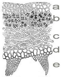 Keywords: File-Meyers b6 s0351a.jpg Diagram of Sticta fuliginosa with layers a/b/c/d/e Bild von Sticta fuliginosa mit a/b/c/d/e Ст оение гете оме ного лишайника на п име е Sticta fuliginosa a - ко ковый слой b - гонидиальный слой c - се дцевина d - нижняя ко а e - изины Meyers b6 s0351 jpg - 1885 1890 author PD-Meyers Lichen anatomy and morphology Sticta fuliginosa Images from Meyers Konversationslexikon 4th edition - text figures Meyers b6 s0351