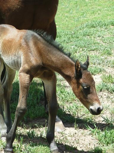 Keywords: filly newborn bay foal horse farm mare baby young animal cute equine brown nature summer rural grass pasture meadow domestic mother ranch colt grazing explore new