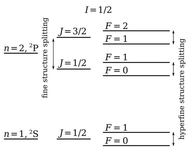 | Keywords: Fine hyperfine levels.svg Fine and hyperfine structure in hydrogen The coupling of the different angular momenta leads to energy level splitting Not drawn to scale The electron spin angular momentum S is coupled to the electron orbital angular momentum L to form the total electronic angular momentum J This is subsequently coupled to the nuclear spin angular momentum I to form the total angular momentum F The term symbol takes the form <sup>2S+1</sup>L with the values of L represented by letters S P D F G H 0 1 2 3 4 5 so that for instance a <sup>2</sup>P term represents a state with S 1/2 and L 1 The single electron in a 1s subshell gives rise to the <sup>2</sup>S term L 0 and S 1/2 can only combine to give J 1/2 This in turn can combine with the nuclear spin I 1/2 to give total angular momentum F 0 1 The single electron in a 2p subshell gives rise to the <sup>2</sup>P term L 1 and S 1/2 can combine to give J 1/2 and J 3/2 These can combine with the nuclear spin I 1/2 to give total angular momenta F 0 1 and F 1 2 respectively The hyperfine splitting of the ground <sup>2</sup>S state is the source of the 21 cm hydrogen line important in astronomy File Fine_hyperfine_levels png originally created by User DJIndica Converted to SVG by w User Edudobay w User Edudobay 2010-05-16 Radio astronomy History of physics Cosmology Spectroscopy Hydrogen physics |