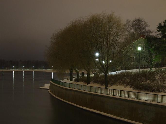 Keywords: finland night evening sky clouds trees river water canal waterway bridge house architecture lights winter snow ice outside