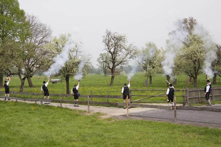 Keywords: firecrackers shooting bavarian austrian pillory shooting tradition festival event firecracker devices black powder crash smoke fruit trees spring salute shoot shot pop bavarian austrian leather pants costume