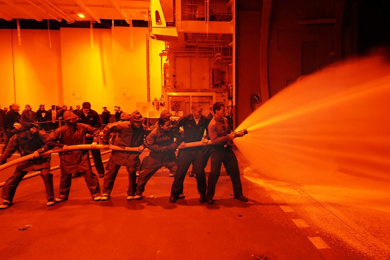 Keywords: firefighters training live fire protection danger equipment hose helmet spray nozzle job practice fireman safety service ship
