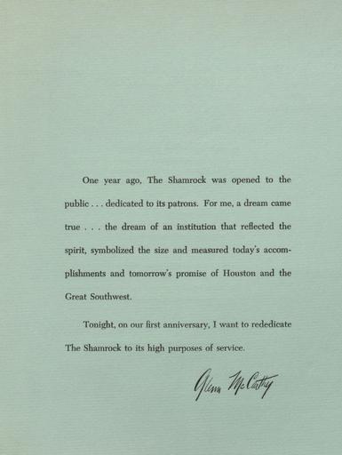 | Keywords: First Anniversary Saint Patrick's Day celebration - message from Glen McCarthy.jpg en Shamrock Hotel Houston Texas First Anniversary Saint Patrick's Day Celebration message from Glen McCarthy 1950 The University of Houston Digital Library http //digital lib uh edu The University of Houston Digital Library Custom license marker 2012 04 29 This image is in the public domain and may be used freely If publishing in print electronically or on a website please use the citation Courtesy of Special Collections University of Houston Libraries To order a higher resolution reproduction see http //info lib uh edu/about/campus-libraries-collections/special-collections-archives/request-digital University of Houston Libraries Uploaded with UploadWizard 1950 documents Saint Patrick's Day in the United States Hotels in Houston Food menus 1950 in Houston |