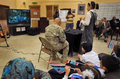 Keywords: First-ever video conference between Iraqi, U.S. children DVIDS129004.jpg en An Iraqi girl speaks via internet conference to American students within the Moral Welfare and Recreation building during her visit to Forward Operating Base Falcon Iraq that hosted the first ever video teleconference between Iraqi students and American students on Nov 12 Students from Nolanville Elementary outside of Fort Hood Army Base Texas interact with Iraqi students of Al Khartoon Elementary located in the Doura community of southern Baghdad The students asked each other various questions building relations between their two cultures 2008-11-12 Petty Officer 2nd Class Todd Frantom https //www dvidshub net/image/129004 081112-N-+++++-893 2008-11-16 23 33 FORWARD OPERATING BASE FALCON IQ PD-USGov-Military-Navy Forward Operating Base Falcon Images from DoD uploaded by Fæ |