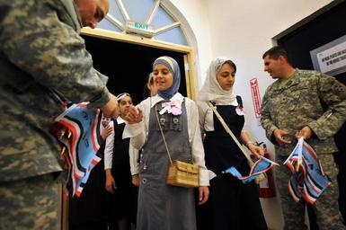 Keywords: First-ever video conference between Iraqi, U.S. children DVIDS129021.jpg en Iraqi children enter the Moral Welfare and Recreation building receiving Iraqi flags from U S Soldiers during their visit to Forward Operating Base Falcon Iraq that hosted the first ever video teleconference between Iraqi students and American students on Nov 12 Students from Nolanville Elementary outside of Fort Hood Army Base Texas interact with Iraqi students of Al Khartoon Elementary located in the Doura community of southern Baghdad The students asked each other various questions building relations between their two cultures 2008-11-12 Petty Officer 2nd Class Todd Frantom https //www dvidshub net/image/129021 081112-N-+++++-502 2008-11-17 00 13 FORWARD OPERATING BASE FALCON IQ PD-USGov-Military-Navy Forward Operating Base Falcon Images from DoD uploaded by Fæ |