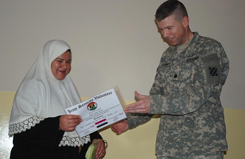 | Keywords: First female Security Volunteers graduate in Adhamiyah DVIDS61545.jpg  en Fort Knox Kentucky-native Lt Col Jeff Broadwater commander of the U S Army's 3rd Squadron 7th Cavalry Regiment presents a certificate to a graduating member of the first class of female Iraqi security volunteers in Baghdad's Adhamiyah neighborhood during a graduation ceremony Oct 12 After completing training organized by the 3-7 Cavalry the women will join hundreds of male residents who are already on duty protecting public places such as schools hospitals and government buildings against terrorists 2007-10-15 Staff Sgt Michael Pryor https //www dvidshub net/image/61545 61545 2007-10-15 08 10 BAGHDAD IQ PD-USGov Fort Knox Images from DoD uploaded by Fæ |