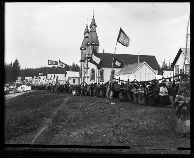 | Keywords: blackandwhite monochrome photo border outdoor black and white First Nations procession out front of Roman Catholic church in Sechelt VPL Accession Number: 19922 Date: 189- Photographer/Studio: Bailey Bros. Content: [First Nations cottages on left] Topic: Church buildings Religion and culture Indians of North America - Dwellings Indians of North America - Clothing Children and adults Flags Processions Culture Location: British Columbia - Sechelt More information on our historical photograph collection: www.vpl.ca/historicalphotos First Nations procession out front of Roman Catholic church in Sechelt VPL Accession Number: 19922 Date: 189- Photographer/Studio: Bailey Bros. Content: [First Nations cottages on left] Topic: Church buildings Religion and culture Indians of North America - Dwellings Indians of North America - Clothing Children and adults Flags Processions Culture Location: British Columbia - Sechelt More information on our historical photograph collection: www.vpl.ca/historicalphotos |