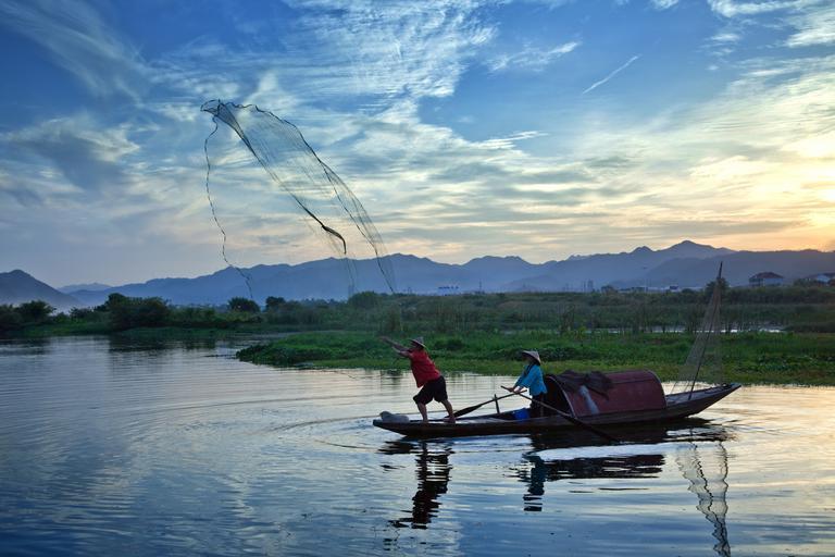 Keywords: fish fishermen ship net lake the water sunset