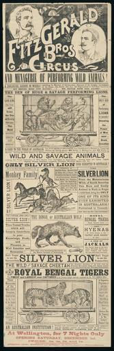 Keywords: text Recto shows head and shoulder portraits of Dan and Tom Fitzgerald, a cage of lions, performing zebras, a dingo, and a cage of Royal Bengal tigers. Quantity: 1 b&w art print(s). Physical Description: Engraving, 897 x 284 mm. Provenance: Presented by Mr S. Thomson, 6 October 1967. Fitzgerald Bro[ther]s Circus and menagerie of performing wild animals...at Wellington, for 7 nights only, opening Saturday, December 1st [Recto. 1894].. Fitzgerald Bro[ther]s Circus and menagerie of performing wild animals...at Wellington, for 7 nights only, opening Saturday, December 1st. Troedel, Cooper & Co., printers, St Clarence Street ... Sydney [1894].. Ref: Eph-E-CIRCUS-1894-01-1. Alexander Turnbull Library, Wellington, New Zealand. natlib.govt.nz/records/22738805 Recto shows head and shoulder portraits of Dan and Tom Fitzgerald, a cage of lions, performing zebras, a dingo, and a cage of Royal Bengal tigers. Quantity: 1 b&w art print(s). Physical Description: Engraving, 897 x 284 mm. Provenance: Presented by Mr S. Thomson, 6 October 1967. Fitzgerald Bro[ther]s Circus and menagerie of performing wild animals...at Wellington, for 7 nights only, opening Saturday, December 1st [Recto. 1894].. Fitzgerald Bro[ther]s Circus and menagerie of performing wild animals...at Wellington, for 7 nights only, opening Saturday, December 1st. Troedel, Cooper & Co., printers, St Clarence Street ... Sydney [1894].. Ref: Eph-E-CIRCUS-1894-01-1. Alexander Turnbull Library, Wellington, New Zealand. natlib.govt.nz/records/22738805 |