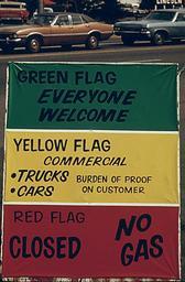 | Keywords: FLAG POLICY DURING THE 1973 oil crisis.gif GASOLINE DEALERS IN OREGON DISPLAYED SIGNS EXPLAINING THE FLAG POLICY DURING THE FUEL CRISIS IN THE WINTER OF 1973-74 AS THE SIGN SAYS THE GREEN FLAG MEANS ANYONE CAN GET GAS THE YELLOW IS FOR COMMERCIAL VEHICLES ONLY AND A RED FLAG MEANS NO GAS AT ALL NARA-image 555518 1974-05 PD-USGov PD-USGov Gas stations in Oregon Signs in Oregon 1974 in Oregon Energy crises DOCUMERICA 1973 oil crisis Green red yellow | ||||