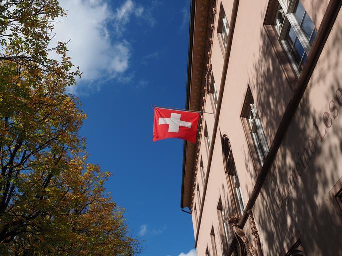 Keywords: flag switzerland wind flutter cross red white home facade blow city basel