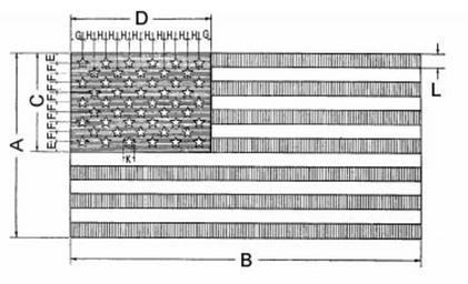 | Keywords: Flag of the United States specification.jpg This diagram of the flag of the United States was given in Executive Order 10834 by Dwight D Eisenhower on August 21 1959 see w List of United States federal executive orders It appears in the United States Code title 4 chapter 1 http //assembler law cornell edu/uscode/html/uscode04/usc_sec_04_00000001----000-notes html Text of executive order here For a better diagram of the flag see Image Flag of the United States specification svg The law specifies the lengths in the diagram as follows Hoist width of flag A 1 0 Fly length of flag B 1 9 Hoist width of Union C 0 5385 7/13 Fly length of Union D 0 76 E F 0 054 G H 0 063 Diameter of star K 0 0616 Width of stripe L 0 0769 1/13 Presumably E and F are supposed to be 7/130 0 0538461 and G and H are supposed to be 0 76/12 0 063 PD-USGov Flag construction sheets of the United States 1950s technical drawings Executive orders of the United States |