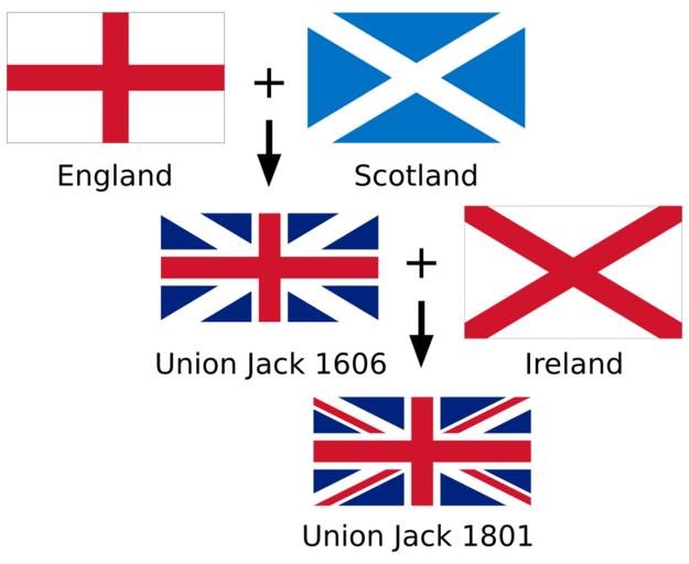 | Keywords: Flags of the Union Jack named en.svg Development of the Union Jack the cross of St George flag of England was combined with the saltire of St Andrew flag of Scotland to form the flag of Great Britain The flag of Great Britain was then combined with the red saltire of the insignia of the 1783 royal Order of St Patrick not the flag of Ireland to form the flag of the United Kingdom Entwicklung des Union Jack Die Flagge Englands rotes Georgskreuz auf weißem Grund und die schottische Flagge weißes Andreaskreuz auf blauem Grund wurden kombiniert zur Flagge Großbritanniens Diese wurde kombiniert mit dem den 1783 gegründeten Order of St Patrick repräsentierenden Patrickskreuz zur Flagge des Vereinigten Königreichs self-made based on Image Flags of the Union Jack svg 2016-06-27 Guilherme Paula derivative work Master Uegly Development of the Union Jack |