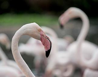 Keywords: flamingo portrait greater flamingo phoenicopterus roseus bird pink wading wader wildfowl waterfowl eye beak neck curve curved plumage feather group social wetlands aquatic