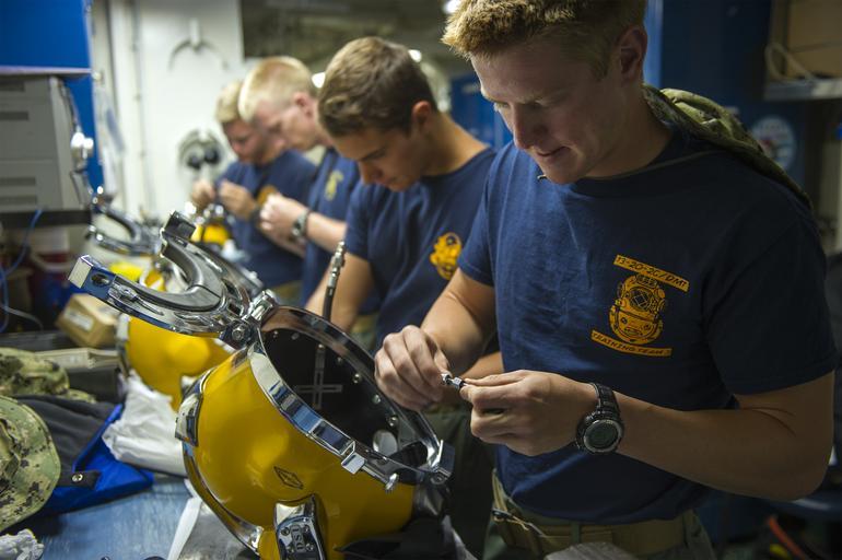 Keywords: Fleet Readiness Training Program 130617-N-YD328-010.jpg en Navy Diver Seaman Garrett Mucillo assigned to Mobile Diving and Salvage Unit Two MDSU2 assembles a Mark V Kirby Morgan diving helmet aboard USNS Grasp T-ARS-51 during MDSU2's Fleet Readiness Training Program FRTP in Key West Fla FRTP is an ongoing two-year training pipeline encompassing all required skills for a MDSU2 company deployment Training aboard USNS Grasp is conducted with members of the Military Sealift Command who operate the ship and provide support for the Navy Divers U S Navy photo by Mass Communication Specialist 3rd Class Nicholas S Tenorio/Released 2013-06-17 Petty Officer 3rd Class Nicholas Tenorio https //www dvidshub net/image/959569 130617-N-YD328-010 2013-06-24 13 17 KEY WEST FL US 3 PD-USGov-Military-Navy United States Navy Mobile Diving and Salvage Unit Two Images from DoD uploaded by Fæ |