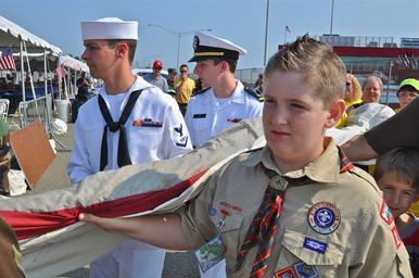 Keywords: Fleet Week New York 2012 120526-N-FV870-005.jpg en Sailors from the guided-missile destroyers USS Mitscher DDG 57 and USS Donald Cook DDG 75 volunteers from the Boy Scouts of America and bystanders take part in the unfurling of The National 9/11 Flag at USS The Sullivans Pier during a public display of the flag for Fleet Week New York 2012 The flag was discovered shortly after the attacks on Sept 11 2001 tattered and torn hanging on the side of a building near the World Trade Center site As part of an effort to restore it the flag has traveled the country and received repair patches from retired flags in all 50 states This summer the flag will receive another patch containing fibers of the Star-Spangled Banner housed at Fort McHenry in Baltimore Maryland Fort McHenry marks the site where Francis Scott Key wrote the poem that would become the national anthem in 1814 during the War of 1812 The National 9/11 Flag will go on permanent display at the 9/11 Memorial in Manhattan N Y once construction of the memorial is complete This marks the 25th year the city has celebrated the nation's sea services for the citizens of New York and the tri-state area This year the seven-day event coincides with the commemoration of the Bicentennial of the War of 1812 with more than 6 000 service-members from the Navy Marine Corps and Coast Guard sea services in addition to coalition ships from around the world U S Navy photo by Mass Communication Specialist 1st Class Jeremy K Johnson 2012-05-26 Petty Officer 1st Class Jeremy Johnson https //www dvidshub net/image/589969 120526-N-FV870-005 2012-05-29 20 50 NEW YORK NY US PD-USGov-Military-Navy USS Donald Cook DDG-75 Images from DoD uploaded by Fæ |