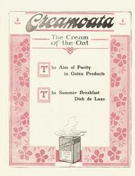 | Keywords: text Creamoata "the cream of the oat" represents "the aim of purity in oaten products", and "the summer breakfast dish de luxe". Shows a packet of creamoata with a steaming bowl of oat porridge on top of it. The whole is in a wide floral border. Quantity: 1 colour photo-mechanical print(s) on pamphlet. Physical Description: Offset print on folded pamphlet, 297 x 230 mm. Provenance: Purchased from Barney Brewster, Nelson, in 2004. Fleming & Company Ltd (Gore) :Creamoata, the cream of the oat. [ca 1910]. [Pamphlet advertising Methven boilers and pipes, Creamoata, Thomson's Purity Raspberry Vinegar, and Thomson's Purity Lime Juice. ca 1910].. Ref: Eph-B-RETAIL-1910-01-02. Alexander Turnbull Library, Wellington, New Zealand. natlib.govt.nz/records/23132657 Creamoata "the cream of the oat" represents "the aim of purity in oaten products", and "the summer breakfast dish de luxe". Shows a packet of creamoata with a steaming bowl of oat porridge on top of it. The whole is in a wide floral border. Quantity: 1 colour photo-mechanical print(s) on pamphlet. Physical Description: Offset print on folded pamphlet, 297 x 230 mm. Provenance: Purchased from Barney Brewster, Nelson, in 2004. Fleming & Company Ltd (Gore) :Creamoata, the cream of the oat. [ca 1910]. [Pamphlet advertising Methven boilers and pipes, Creamoata, Thomson's Purity Raspberry Vinegar, and Thomson's Purity Lime Juice. ca 1910].. Ref: Eph-B-RETAIL-1910-01-02. Alexander Turnbull Library, Wellington, New Zealand. natlib.govt.nz/records/23132657 |