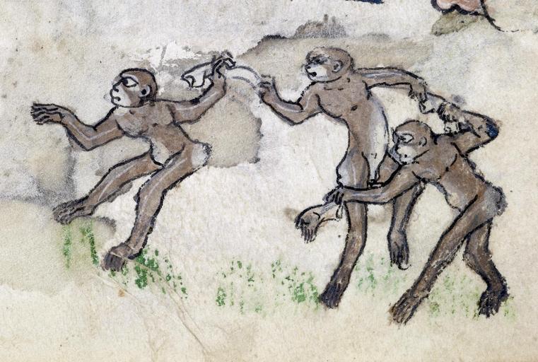 Keywords: Flemish - Apes Dancing to Ring-around-a-Rosy - Walters W82193R - Detail A.jpg The song Ring-around-a-Rosy is still popular today often danced in a circle just as we see the monkeys doing here Yet this seemingly lighthearted song has a dark past The plague swept Europe during the 14th century and the song's words actually refer to its terrible symptoms a circular rose-colored rash sneezing or coughing and finally death Flower petals were worn in a pouch around the neck to keep the smell of death away The song then seems very different in this context Ring-a ring-o-rosies A pocket full of posies Achoo Achoo We all fall down ca 1315 25 Gothic parchment with ink and paint cm 16 11 accession number W 82 193R 81316 Henry Walters Baltimore after 1894 by purchase Walters Art Museum Henry Walters Acquired by Henry Walters after 1894 Illuminated Manuscripts Masterpieces in Miniature The Walters Art Gallery Baltimore 1984-1985 Checkmate Medieval People at Play The Walters Art Museum Baltimore 2010 place of origin Ghent Belgium Walters Art Museum license 2D Media contributed by the Walters Art Museum needs category review Dancing animals in art Ring a Ring o' Roses in art Medieval miniatures of monkeys Walters MS W82 - Psalter-Hours Monkeys acting as humans in art |