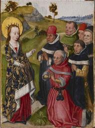 Keywords: Flemish - Saint Catherine Converting the Scholars - Walters 372487.jpg Catherine of Alexandria was one of the most popular saints in medieval western Europe Legend describes her as a wise and beautiful virgin of noble birth who was executed for being a Christian This image and its two associated panels Walters 37 2486 and 37 2488 show Catherine confronting the Roman emperor converting the learned pagans who were supposed to disprove her Christian beliefs and with the help of the Holy Spirit confounding a second group of scholars sent to visit her in prison The panels were once part of an altarpiece recounting the entire story of Catherine's martyrdom ca 1480 Late Medieval oil on panel cm 20 5 15 2 accession number 37 2487 39056 Leopold Blumka New York prior to 1943 by purchase Dr R Walter Graham Jr Baltimore 1971 by purchase Walters Art Museum Gift of Dr R Walter Graham Jr 1972 Time Sanctified The Book of Hours in Medieval Art and Life The Walters Art Gallery Baltimore 1988 Realms of Faith Medieval and Byzantine Art from the Walters Art Museum Museum of Biblical Art New York; Colby College Museum of Art Waterville; Joslyn Art Museum Omaha 2008-2009 place of origin Flanders Belgium Walters Art Museum license 2D Medieval art in the Walters Art Museum Flemish paintings in the Walters Art Museum Media contributed by the Walters Art Museum needs category review Paintings of Saint Catherine of Alexandria Triptych Altarpiece with Scenes from the Life of Saint Catherine