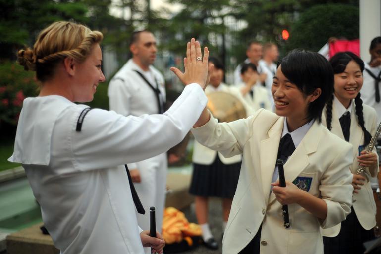 Keywords: Flickr - Official U.S. Navy Imagery - A Sailor celebrates with a member of Seika Girls High School..jpg HAKATA Japan Aug 11 2012 Musician 3rd Class Christa Vernon assigned to the U S 7th Fleet Band celebrates with a member of Seika Girls High School during after their performance during a concert in the American consulate in Fukuoka Japan U S Navy photo by Mass Communication Specialist 2nd Class Rafael Figueroa Medina/Released 120811-N-QI421-607 Join the conversation http //www facebook com/USNavy www facebook com/USNavy http //www twitter com/USNavy www twitter com/USNavy http //navylive dodlive mil navylive dodlive mil http //www flickr com/photos/usnavy/7781222266/ A Sailor celebrates with a member of Seika Girls High School 2012-08-11 16 50 http //www flickr com/people/56594044 N06 Official Navy Page from United States of America MC2 SW/AW Rafael Figueroa Medina/U S Navy U S Navy photo PD-USGov-Military-Navy Official U S Navy Imagery http //flickr com/photos/56594044 N06/7781222266 2012-11-12 22 29 48 cc-by-2 0 Images from United States Navy to check |