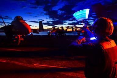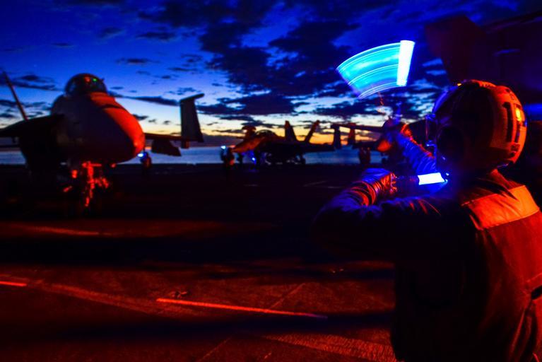 Keywords: Flight deck operations aboard USS John C. Stennis 150125-N-TC437-150.jpg en Sean Cyr a civilian plane captain from Corpus Christi Texas prepares an F/A-18F Super Hornet from the Flying Eagles of Strike Fighter Squadron 122 for take off on the flight deck of Nimitz-class aircraft carrier USS John C Stennis Stennis is currently undergoing an operational training period in preparation for future deployments 2015-01-25 VFA https //www dvidshub net/image/1738320 150125-N-TC437-150 2015-01-28 06 07 USS JOHN C STENNIS USPACOM AT SEA PD-USGov-Military-Navy F/A-18F Super Hornet Images from DoD uploaded by Fæ |