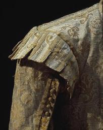 | Keywords: Flikig axelkarm från 1620-talet - Livrustkammaren - 30282.tif LSH artwork sv Tröjan nämns i Klädkammarens inventarium 1672 <br/> 1 Tröija af gÿllenduuk med gull blommor underfordrat med hwidh lärfft ------50 - <br/>Tröjan är tillverkad av brokad Bottenväven är av vitt silke med lanserade silvertrådar Sex olika typer av blom- och bladfigurer är fördelade över ytan i ett diagonalmönster Dessa är vävda i guldgult silke med glesa guldtrådar som löper två och två med ca 1 5 millimeters mellanrum Mönsterrapporten är 196 x 139 mm <br/>Tröjan är tillverkad i en modell med liv i sex delar framstycken sidstycken och bakstycken Ärmarna är av tvåsömstyp och inramas vid ärmhålet av flikiga axelkarmar Livet avslutas upptill med en ståndkrage och nertill med ett långt skört i åtta delar <br/>Livet <br/>Livets midjelinje avslutas i en spets mitt fram Midjemåttet är 98 cm Framkanterna är ca 44 5 cm långa och löper längs med tygets trådrak Tröjan knäpps mitt fram med 25 st knappar Knapphålen sitter på vänster framstycke De är 18-19 mm långa och inpassade mellan två guldgaloner En som skor ytterkanten och en som löper parallellt med denna Knapphålstränsarna är 3-4 mm breda Knapparna som sitter på höger framstycke är av en rund modell och flätade av guldtråd De är ca 7 mm i diameter 5 mm höga och är fastsydda med en 5 mm hög hals av citrongult silke Knapparna är placerade 4 mm från framkanten och 15-17 mm isär 2 cm från framkanten och parallellt med denna är en guldgalon fastsydd Längst ner i spetsen på vardera framstycket 6 mm från framkanten och 12-13 mm ovanför midjelinjen är ett sytt hål Dessa hål är 8-10 mm i diameter och sydda med kaststygn Hålen hamnar troligen ovan på varandra när tröjan knäpps De främre sidsömmarna är placerade under ärmen och de bakre bildar en diagonal linje mot bakstyckenas sneda sidlinjer De bakre sidsömmarna täcks av guldgaloner Livet har en dekorativ knäppning mitt bak istället för söm En knappslå 2 5-3 cm bred och 36 5 cm lång är fastsydd vid höger bakstycke På denna är 19 st 18-19 mm långa knapphål i citrongult silke Dessa motsvaras av lika många knappar på det vänstra bakstycket Knapparna är ca 11 mm i diameter och välvda till formen De är flätade av glest tvinnade guldsnoddar över en stomme med ett hål i mitten Denna är troligtvis av trä Knappslån är i ytterkant skodd med en guldgalon och sömmen mellan knappslån och bakstycket täcks likaså med en galon Galonerna löper kant i kant med knapphålen på bägge sidor av dessa Där bak- och framstyckena möts vid axelsömmen bildar dessa en spets ut mot axeln Axelsömmen täcks av en guldgalon och ärmhålet är kantat runt om av en galon <br/>Ärmarna <br/>Ärmarna är av tvåsömstyp med en svängd form De är smala vid handleden och rymligare upptill I ärmens innerdel mitt i ärmhålets ringning är ett 5 8 cm djupt sprund i vilket är isatt en 5 5 cm hög och 4 cm bred kil <br/>Ärmens främre söm är till större delen öppen och kan knäppas med 24 st guldknappar av samma typ som i ryggen I vänster ärm saknas en knapp Slitsen i ärmens främre söm börjar 4 cm ovanför ärmfållen och slutar precis vid axelkarmens nedre del ca 7 5 cm från ärmhålet En lös knappslå 2 3 cm bred och 46 2 cm lång är fastsydd i ärmens ytterdel Ärmdelarna är inte ihopsydda ovanför knappslån Knappslån kantas med en guldgalon och har 24 st 18-19 mm långa knapphål i citrongult silke Knapphålen in ramas av kantgalonen och en parallell galon som täcker sömmen mellan knappslån och ytterärmen Knapparna är fastsydda med samma gula silke som i knapphålen De har en ca 2 mm hög hals Ärmens bakre söm avslutas längst ner vid handleden i ett 21 cm långt sprund Sömmen täcks av en guldgalon vilken viks lätt om ytterärmens kant där knapphålen börjar och sedan fortsätter längs med ärmfållen runt handleden På knapphålens andra sida löper en likadan galon Den sneddar upp till in under ärmsömmens galon och försvinner nertill in under samma galon vid handleden Sprundet knäpptes ursprungligen med 10 st små knappar av flätad guldtråd Av dessa återstår nu endast fyra på den högra ärmen Knapparna är fästa på ärmens inre del och knapphål av citrongult silke är sydda på den yttre Dessa är 18-19 mm långa och fyller ut hela utrymmet mellan de båda galonerna Knapparna är av samma typ som i knäppningen mitt fram De är fastsydda med en kantilj på toppen När ärmarna sytts fast i livet är ärmkilens bakre del i höjd med sömmen mellan fram- och sidstycket <br/>Axelkarmarna är uppbyggda av 10 st flikar Dessa är bredare upptill så att ärmhålslinjen fylls ut och smalnar av nedtill Axelkarmarnas ytterkanter är formade så att en spets bildas längst ut på axeln på samma sätt som ärmhålet avslutas i en spets Flikarnas bredd varierar i både ovan- och nederkanterna Fliken längst bak i vardera ärmhålet är oproportionerligt bred Flikarna dekoreras av en guldgalon längs med vardera sidan Dessa är placerade 2-3 mm från kanten Flikarna är ihopsydda med varandra i ovankanten till drygt halva sin längd I punkten där sömmen upphör hålls de samman av en träns Tränarna är utförda i citrongult silke De är ca 2 mm breda och klädda med knapphålsstygn med knutarna vända ut från axeln Flikarna är tillskurna i inslagsriktning De är vikta i den linje som bildar axelkarmens ytterkant och tyget fortsätter på baksidan upp ovanför silkestränsarna Ovanför dessa är baksidan fodrad med citrongul sidentaft troligen slutar brokaden under fodret Sidenfodret är fastsytt med glesa prickstygn Guldgalonen på axelkarmarnas flikar är påsydd efter att dessa sytts samman men innan de fodrats Galonen är inte avklippt utan löper i ett Den vänder i ett V-format veck på axelkarmens baksida i höjd med tränsarna och fortsätter upp på nästa flik <br/>Kragen <br/>Kragen ä