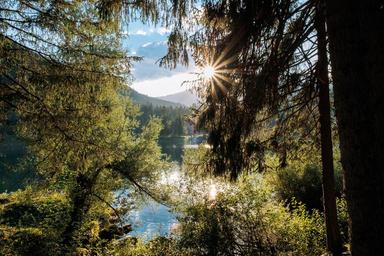 Keywords: flims graubünden switzerland caumasee bergsee water summer landscape lake forest island sky bank clouds alpine mountains nature panorama sun back light mood fairy tales