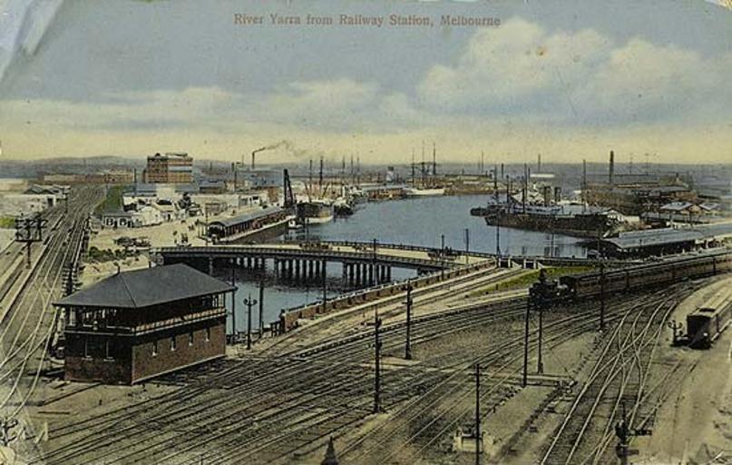 | Keywords: FlindersStreetA-SignalBox.jpg Rail yards beside the Yarra River Two trains in the yards Horse-drawn vehicles crossing bridge in background There is a signal box on the left and rail tracks crossing the river There are steam and sailing ships in the river Location Melbourne Victoria Australia Museum Victoria http //museumvictoria com au/railways/image aspx PID 755 ~ 1913 NORM DE POMEROY PD-Australia Flinders_Street_Station | ||||