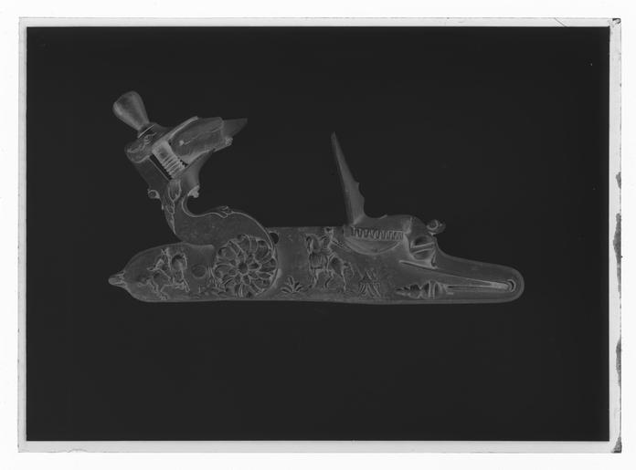 | Keywords: Flintlåsbössa av fransk-nederländsk typ ca 1650, stock av Johan Eberhart Sommer, Künzelsau - Livrustkammaren - 26786-negative.tif Publius Cornelius Scipio Africanus konsul plain text Rund slätborrad pipa av stål godstjocklek vid mynningen 0 8 mm Åttsidig kammaren vid övergången en smal ring kanterna fasade 12 mm bakom ringen vid pipbasen likaså en profilerad vulst på de tre övre faserna Därframför ett dekorfält i stålsnitt l 110 mm nästan hela fältet förgyllt baktill ett snäckliknande ornament med två nedhängande bladfestonger Därframför tre ryttare alla i rustning den i mitten barhuvad fas fältherrestav i h hand den h ryttaren har stav i v hand och fana i h den v ryttaren likaså fana båda hjälmklädda Ornamentfältet framtill avslutad med liknande snäckornament med bladfestonger kompletterade med bladknippe i mitten Rektangulärt svansskruvblad svagt böjt med bladdekor i stålsnitt <br/>Riktmedel Hjärtformigt sikte av förgylld mässing stolpkorn av mässing <br/>Fästning Pipan fäst med krysskruv underifrån dold av avtryckarblecket samt tre pipstift av stål <br/><br/>Flintlås med plant låsbleck delvis något fasade kanter dekor i stålsnitt på låsblecket bakom hanen ryttare i 1600-talsdräkt med fältherrestav i bakgrunden stad till h om hanen tillbakaseende fältherre till häst i bakgrunden tält S-formig platt hane med små rundade käkar överkäken lös graverad och punsad drakdekor rundat koniskt käkskruvhuvud hanskruv med huvud täckande hela hankroppen stålsnittsdekor i form av blomma Fängpanna med liten fals på gaveln sicksackdekor Batteri med rektangulärt eldstål med rundad överkant liten profilering nertill på ryggen Batterifjäder utan studel litet sexflikigt fjäderlöv Nöt utan studel <br/>Fästning Två låsskruvar <br/>C-formig avtryckare Rektangulärt avtryckarbleck <br/><br/>Helstock av valnöt med kolv av tidig fransk typ På kolvens h och undersida snidad dekor på h sida stridsscen täckande hela sidan ryttare i antikiserande rustningar och i förgrunden till v en på marken sittande skäggig krigare som stöttas av två krigare och framför honom en yngre man som håller en häst vid tygeln Längs nederkanten en inskuren latinsk text Scipio cui magnum dives dedit Affrica nomen // pugnantem ad Trebia litus mane patrem samt i ny spalt till h Eximit ingenti pressum discrimine belli // Iam puer et tuta sub statione locat Scipio som det rika Afrika gav ett stort namn giver redan såsom gosse den tidigt vid Trebias strand kämpande fadern ett säkert hägn och borttager honom från det genom ofantliga faror tryckande kriget Längst till höger signering Iohan EberHart // Somer Kolvens undersida svagt rundad två rektangulära fält båda med krigare i helfigur det bakre med en man sedd snett bakifrån huvudet profil h på huvudet ett lejonhuvud med manen hängande ner på ryggen antik rustning och kort mantel h hand håller i oval sköld v arm upplyft och håller i stav Herkules Det främre fältets man likaså sedd snett bakifrån huvudet profil v antik rustning med hjälm o plym ingen mantel gehäng med svärd v hand vilar på höften h håller en på marken stödd sköld Framför de två fälten en i bladverk övergående maskaron Hela stocken i övrigt dekorerad med rankverk av silvertråd med blad och blommor av graverade pärlmorplattor På anslaget i rankverket dessutom 17 fåglar av olika slag däribland en uggla och fem påfåglar i mitten en med uppfälld stjärt Belag av graverat silver bakplåt fäst med sju stålspikar runt spikarna samt mitt på bakplåten graverade blad Två släta rörkor samt näsband med blomdekor Varbygel av stål med korta släta armar främre stolpen kluben och främre armen har del även bakom stolpen litet flikigt löv baktill På bygeln en hillebardiär i låg relief <br/><br/>Tillbehör <br/>Laddstock av stockens trä l 1142 mm framtill skodd med silver l 27 mm med geometrisk dekor I andra änden spår av annat beslag original caption ca 1650 walnut e3 - eldvapen - stock material valnöt - steel e127 - eldvapen - pipa lås och stockbeslag material stål - silver thread e8 - eldvapen - stockdekor material silvertråd - silver e7 - eldvapen - stockbeslag material silver - mother-of-pearl e8 - eldvapen - stockdekor material pärlemor - brass e4 - eldvapen - riktmedel material mässing g 2520 size mm 1162 pipa size mm 1555 LRK Künstlerfamilie Sommer 1985 Scipio cui magnum dives dedit Affrica nomen // pugnantem ad Trebia litus mane patrem // Eximit ingenti pressum discrimine belli // Iam puer et tuta sub statione locat anv e3 - eldvapen - stock; Elin Thegerström Iohan EberHart // Somer anv e8 - eldvapen - stockdekor; Johan Eberhard Sommer Scipio cui magnum dives dedit Affrica nomen // pugnantem ad Trebia litus mane patrem // Eximit ingenti pressum discrimine belli // Iam puer et tuta sub statione locat anv e3 - eldvapen - stock; Elin Thegerström Iohan EberHart // Somer anv e8 - eldvapen - stockdekor; Johan Eberhard Sommer place of origin original filename LN_B08153_011033 55357 inventory number LRK 18794 26786 CC0 Flintlåsbössa av fransk-nederländsk typ ca 1650 stock av Johan Eberhart Sommer Künzelsau - Livrustkammaren - 26786 tif <gallery caption Different images of same object > File Flintlåsbössa av fransk-nederländsk typ ca 1650 stock av Johan Eberhart Sommer Künzelsau - Livrustkammaren - 43890 tif File Flintlåsbössa av fransk-nederländsk typ ca 1650 stock av Johan Eberhart Sommer Künzelsau - Livrustkammaren - 81541 tif File Flintlåsbössa av fransk-nederländsk typ ca 1650 stock av Johan Eberhart Sommer Künzelsau - Livrustkammaren - 64420 tif File Flintlåsbössa av fransk-nederländsk typ ca 1650 stock av Johan Eberhart Sommer Künzelsau - Livrustkammaren - 72982 tif File Flintlåsbössa av fransk-nederländsk typ ca 1650 stock av Johan Eberhart Sommer Künzelsau - Livrustkammaren - 77798 tif File Flintlåsbössa av fransk-nederländsk typ ca 1650 stock