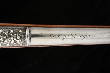 | Keywords: Flintlåspistol, ca 1650 - Livrustkammaren - 13958.tif Rund slätborrad pipa av stål rektangulärt svagt böjt svansskruvblad På svansskruvblad och pipbas påslagen silverdekor i form av korsskrafferade kulor samt pärlstavs- och bladbårder På kammarens ovansida därframför fält med stålsnittsdekor l 54 mm kvinna i djupt urringad klänning med släp över h arm solfjäder i v hand i bakgrunden borg Därframför fält med påslagna blomrankor av silver l 52 mm Resten av pipan slät graverat ägarnamn Carl Gustaf Tessin På kammarens undersida en otydlig stämpel med bokstäver sista bokstäverna AS möjligen COLAS jfr nr 11670 <br/>Fästning Två häften Pipan fäst med bakrelåsskruven genom svansskruvplattan samt två pipstift av stål <br/><br/>Flintlås med plant låsbleck svagt fasade kanter Dekor i stålsnitt på bakspetsen hundhuvud övergående i bladfestonger framför hanen ryttare i halvrustning marskalksstav i ena handen därframför tre pikenerare stående i sänka benen syns ej S-formig platt hane hanskruvens huvud täckt av porträttbyst i relief av man fas höger allongeperuk nedvikt krage Triangulära käkar överkäken lös kantig hangren omvänt koniskt käkskruvhuvud Rundad fängpanna batteri med välvt fängpannelock plan ovansida rektangulärt eldstål med rundad överkant filad dekor nertill på ryggen liten kommaformig häl Batterifjäder med litet flikigt löv Nöt utan studel <br/>Fästning Två låsskruvar <br/>S-formig avtryckare med upprullad ände Slätt avtryckarbleck <br/><br/>Helstock av buxbom kolv med tillplattat ovalt tvärsnitt Enkel snidad bladdekor bakom svansskruvbladet däromkring samt runt svansskruvbladet inslaget bård av cirklar på kolvens högra sida inslaget hertig Karl XIII rustkammarmärke Beslag av stål kolvkappa med korta flikar på kolvsidorna dekor i stålsnitt fältläger med tält och på ena sidan en ryttare med rundsköld och kroksabel på motsatt sida en ryttare med en stav På flikarna bladrankor samt blommor Sidblecket saknas Två svagt profilerade rörkor slätt näsband Varbygel med kluven framstolpe och kort främre arm lång slät bakre arm <br/><br/>Tillbehör <br/>Laddstock av stockens trä l 279 mm original caption Flintlåspistol ca 1650 - LRK 11670<br/> Nyckelord Pistol Signatur Tessin Detalj Föremålsbild ca 1650 silver e8 - eldvapen - stockdekor material silver - steel e127 - eldvapen - pipa lås och stockbeslag material stål size mm 472 size mm 287 pipa size mm 128 g 870 LRK Carl Gustaf Tessin Envoyé informator 1695-1770 Sverige Karl XIII av Sverige -Norge Gallica 1945 Musket Roer en Pistolet 1974 Livrustkammarens basutställning 1978 Från Topp till tå Nationalmuseum Läckö 2004 1700-tal CG Tessin på Läckö 2005 Basutställning COLAS jfr CMIL anv e1 - eldvapen - pipa; Ezechias Colas Carl Gustaf Tessin place of origin Sedan original filename lm_dig1231 47686 inventory number LRK 11670 13958 CC-BY-SA Göran Schmidt <gallery caption Different images of same object > File Flintlåspistol möjligen fransk ca 1650 pipan stämplad COLAS Ezechias Colas Sedan - Livrustkammaren - 9037 tif File Flintlåspistol möjligen fransk ca 1650 pipan stämplad COLAS Ezechias Colas Sedan - Livrustkammaren - 35338 tif File Flintlåspistol - Livrustkammaren - 22521 tif </gallery> Göran Schmidt Flintlock pistol Images from Livrustkammaren Signatures Media contributed by LSH unmatched material Media contributed by LSH dim-with multiple size templates Media contributed by LSH unmatched creator Media contributed by LSH unmatched keyword Color images from Livrustkammaren Media contributed by LSH 2013-10 |