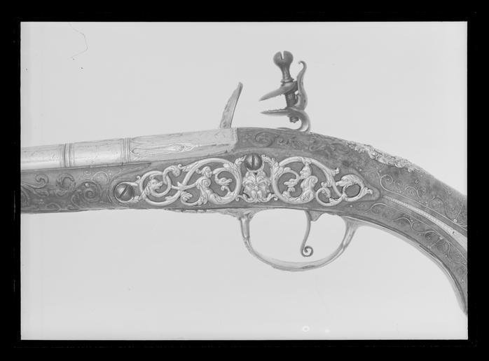 | Keywords: Flintlåspistol för dam eller barn, Bertrand Piraube, Paris ca 1676 (enl. Hayward II) - Livrustkammaren - 61017.tif Rund slätborrad pipa av silver med förgylld ovansida kammarens ovansida femsidig och graverad framtill åttsidig och profilerad mellandel omgiven av ringar På kammarens bakre del graverat en man i antikiserande rustning hjälm med plymer h hand på sidovapnet Runt ribban baktill graverat två delfiner Runt mynningen graverat en bladstav Rektangulärt svagt böjt svansskruvblad av stål med graverad dekor naken människa bärande ett ymnighetshorn <br/>Riktmedel Plan ribba med pärl- och bladstav avsmalnande mot mynningen avslutning i form av droppformigt blad Korn i form av en fasettslipad diamant slät fattning <br/>Fästning Två inlaxade häften pipan fäst med blånerad krysskruv samt två pipstift av stål <br/><br/>Flintlås med välvt låsbleck av förgyllt silver smal kantlist På bakspetsen bladslingor i relief framför hanen graverat ett kärlekspar och tre hundar i landskap Vid nederkanten graverad signatur PIRAUBE AVX GALLERIES APARIS AP-ligatur Hane batteri batterifjäder och inre låsdelar av stål S-formig hane rankdekor i stålsnitt välvt graverat käkskruvhuvud runda käkar överkäken lös och blånerad käkskruv med droppformigt blånerat huvud Rundad fängpanna av förgyllt silver liten fals Batteri med välvt lock eldstål med rankor i stålsnitt antydan till klump komma-formig häl batterifjäder utan studel fjäderlövet avbrutet <br/>Fästning Två blånerade låsskruvar <br/>Avtryckare med spiralformigt upprullad ände <br/><br/>Helstock av valnöt med snidad rankdekor vid svansskruvblad och spetsrörka På kolven inlagda silvertrådar och stift bildande ett rankverk På kolvryggen vid knappen en genombruten silverplåt i form av en maskaron flankerad av två putti och två sniglar Beslag av förgyllt silver med reliefdekor Kolvkappa med flikar till lås och sidbleck pärlstavkant rankdekor centrumplatta i form av en lejonmask Tumplåt i form av en oval platta med graverad krigarbyst fas h strålkrona runt ovalen rankverk maskaron och två hermer i relief Genombrutet sidbleck i form av groteska rankor i mitten maskaron En + en profilerad rörka spets med ansikte ände i form av bladstav Varbygel med maskaron på bygeln konturerad främre arm med rankverk i relief Lång slät välvd bakre arm med graverad bladranka Runt framstolpen en maskaron stolpen kommer upp ur maskaronens mun Avtryckarbleck av stål Näsband av horn <br/><br/>Tillbehör <br/>Laddstock av rödare träslag l 231 mm konisk skoning av horn l 19 mm original caption ca 1676 walnut e3 - eldvapen - stock material valnöt - steel e2 - eldvapen - lås material stål - silver e1278 - eldvapen - pipa lås stockbeslag och stockdekor material silver - horn e7 - eldvapen - stockbeslag material horn - diamond e4 - eldvapen - riktmedel material diamant size mm 128 g 910 size mm 241 pipa size mm 381 LRK Karl XI av Sverige Idrotts- o turistutställningen i Berlin 1894 Gallica 1945 Krigets prakt 2003-2004 Ryssland och Sverige under 1600-talet Basutställning PIRAVBE AVX GALERIES APARIS anv e2 - eldvapen - lås; Bertrand Piraube PIRAVBE AVX GALERIES APARIS anv e2 - eldvapen - lås; Bertrand Piraube place of origin original filename LN_B08057_010937 40844 inventory number LRK 4281 61017 CC0 Flintlåspistol för dam eller barn Bertrand Piraube Paris ca 1676 enl Hayward II - Livrustkammaren - 61017-negative tif <gallery caption Different images of same object > File Flintlåspistol för dam eller barn Bertrand Piraube Paris ca 1676 enl Hayward II - Livrustkammaren - 17601 tif </gallery> Flintlock pistol Images from Livrustkammaren Media contributed by LSH dim-with multiple size templates Media contributed by LSH unmatched creator Media contributed by LSH 2013-10 |