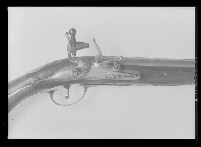 Keywords: Flintlåspistol, Hans Zimmerman, silverbeslag troligen av Daniel Schwarzkopf - Livrustkammaren - 18412.tif Rund slätborrad pipa av stål kammarens bakre del kantig överfasen avbruten av snidade blad och voluter och fortsätter som en plan list fram till kornet samt med ett blad fram till mynningen Böjt svansskruvblad med rundad ände bakom skruvhålet inhugget 4 <br/>Riktmedel Vid pipbasen en profilerad vulst infilad siktskåra Spolformigt korn av silver <br/>Fästning Två häften pipan fäst med krysskruv samt ett urspr två pipstift av stål <br/><br/>Flintlås av stål med välvt låsbleck med smal kantlist graverad dekor i form av dubbla kantlinjer Graverad signatur följande hanens och fängpannans rundningar HANS // ZIMMERMAN // COPENHAGEN S-formigt svängd rundad hane med kantlist och rankdekor med drakhuvud i stålsnitt Hanskruv med x-skåra Runda käkar överkäken låg och blånerad blånerad käkskruv med balusterformigt huvud Rundad fängpanna med skålad fals blad i stålsnitt på ytteränden Batteri med välvt fängpannelock och eldstål på eldstålet kantlister och bladvolut i stålsnitt Batterifjäder med delvis fasade kanter bladdekor bet-formigt fjäderlöv <br/>Fästning Två låsskruvar <br/>Avtryckare med upprullad ände Konturerat avtryckarbleck av blånerat stål <br/><br/>Helstock av valnöt med sliten snidad bladdekor vid svansskruvbladet snidade grenar Näsband av horn Beslag av silver Kolvkappa med långa flikar på kolvsidorna blad- och pärlstavsdekor släta kantlister Oval centrumplatta med lejonmaskaron i relief på plattans insida en silverstav fäst med skruv från varbygelurtaget Under centrumplattan på kolvkappan delvis otydliga silverstämplar otydligare än på nr 4709 Köpenhamn 170 guardein-stämpel CLWM Conrad Ludolf 1679-1729 månadsstämpeln saknas delvis utplånad mästarstämpel D K Böje nr 315 Daniel Schwarzkopf 1699-1727 Oval slät tumplåt med graverat vapen delvis bortslitet krönt med furstligkrona sköldhållare två lejon Hjärtsköld Oranien-Chalon-Geneve åtföljd av ovan Meurs och nedan Bueren Fält 1 Nassau 2 Katzenellenbogen 3 Vianden 4 Dietz 5 Spiegelberg 6 Liessfeldt Sidbleck i form av ett genombrutet rankverk med drakhuvud En + en profilerad rörka slät spets med graverade blad Varbygeln välvd med kantlister främre armen 8-formig med symmetriskt genombrutet ändblad lång bakre arm med rundad ände blad i relief mittpå bakre armen graverat N 4 original caption - 1702 1711 steel e127 - eldvapen - pipa lås och stockbeslag material stål - silver e47 - eldvapen - riktmedel och stockbeslag material silver - walnut e3 - eldvapen - stock material valnöt - horn e7 - eldvapen - stockbeslag material horn size mm 470 size mm 289 pipa g 960 LRK Johan Wilhelm Friso Nassau-Dietz prins Fredrik I av Sverige C L M W anv e7 - eldvapen - stockbeslag; Condrad Ludolf HANS ZIMMERMAN COPENHAGEN anv e2 - eldvapen - lås; Hans Christian Zimmermann Timmermand C L M W anv e7 - eldvapen - stockbeslag; Condrad Ludolf HANS ZIMMERMAN COPENHAGEN anv e2 - eldvapen - lås; Hans Christian Zimmermann Timmermand place of origin original filename LN_B10032_012912 41225 inventory number LRK 4710 18412 CC0 Flintlåspistol Hans Zimmerman silverbeslag troligen av Daniel Schwarzkopf - Livrustkammaren - 18412-negative tif Flintlock pistol Images from Livrustkammaren Media contributed by LSH dim-with multiple size templates Media contributed by LSH unmatched creator Media contributed by LSH 2013-10