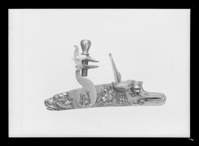 | Keywords: Flintlåspistol, möjligen fransk ca 1650, pipan stämplad: COLAS (?, Ezechias Colas, Sedan?) - Livrustkammaren - 1101.tif Rund slätborrad pipa av stål rektangulärt svagt böjt svansskruvblad På svansskruvblad och pipbas påslagen silverdekor i form av korsskrafferade kulor samt pärlstavs- och bladbårder På kammarens ovansida därframför fält med stålsnittsdekor l 55 mm man i allongeperuk krönt med kurfurstekrona barfota med fotsid dräkt stående framför stadsbild vänster arm pekar mot staden höger mot en piedestal med festonger och därpå liggande krona och spira Därframför fält med påslagna blomrankor av silver l 50 mm Resten av pipan slät graverat ägarnamn Carl Gustaf Tessin På kammarens undersida en otydlig stämpel med bokstäver sista bokstäverna AS möjligen COLAS jfr nr 11670 <br/>Fästning Två häften Pipan fäst med bakre låsskruven genom svansskruvplattan samt två pipstift av stål <br/><br/>Flintlås med plant låsbleck svagt fasade kanter Dekor i stålsnitt på bakspetsen hundhuvud övergående i bladfestonger framför hanen ryttare i halvrustning marskalksstav i ena handen därframför tre pikenerare stående i sänka benen syns ej S-formig platt hane hanskruvens huvud täckt av porträttbyst i relief av man fas höger allongeperuk nedre delen bortbruten Triangulära käkar överkäken lös kantig hangren omvänt koniskt käkskruvhuvud Rundad fängpanna batteri med välvt fängpannelock plan ovansida rektangulärt eldstål med rundad överkant filad dekor nertill på ryggen liten kommaformig häl Batterifjäder med litet flikigt löv Nöt utan studel <br/>Fästning Två låsskruvar <br/>S-formig avtryckare med upprullad ände Slätt avtryckarbleck <br/><br/>Helstock av buxbom kolv med tillplattat ovalt tvärsnitt Enkel snidad bladdekor bakom svansskruvbladet däromkring samt runt svansskruvbladet inslaget bård av cirklar på kolvens högra sida inslaget hertig Karl XIII rustkammarmärke Beslag av stål kolvkappa med korta flikar på kolvsidorna dekor i stålsnitt fältläger med tält och på ena sidan två ryttare i förgrunden I bakgrunden till höger två pikenerare till vänster en trumslagare På andra sidan i förgrunden en ryttare till vänster sittande kvinna till höger fotsoldater på flikarna bladrankor samt blommor Sidblecket saknas Två svagt profilerade rörkor slätt näsband Varbygel med kluven framstolpe och kort främre arm lång slät bakre arm <br/><br/>Tillbehör <br/>Laddstock av stockens trä l 279 mm original caption ca 1650 steel e127 - eldvapen - pipa lås och stockbeslag material stål - silver e8 - eldvapen - stockdekor material silver size mm 467 size mm 287 pipa size mm 125 g 840 LRK Carl Gustaf Tessin Envoyé informator 1695-1770 Sverige Karl XIII av Sverige -Norge Gallica 1945 Livrustkammarens basutställning 1978 Från Topp till tå Nationalmuseum Läckö 2004 1700-tal CG Tessin på Läckö 2005 Basutställning COLAS jfr CMIL anv e1 - eldvapen - pipa; Ezechias Colas Carl Gustaf Tessin place of origin Sedan original filename LN_B08130_011010 47685 inventory number LRK 11669 1101 CC0 Flintlåspistol möjligen fransk ca 1650 pipan stämplad COLAS Ezechias Colas Sedan - Livrustkammaren - 1101-negative tif <gallery caption Different images of same object > File Flintlåspistol möjligen fransk ca 1650 pipan stämplad COLAS Ezechias Colas Sedan - Livrustkammaren - 26161 tif File Flintlåspistol möjligen fransk ca 1650 pipan stämplad COLAS Ezechias Colas Sedan - Livrustkammaren - 51930 tif File Flintlåspistol möjligen fransk ca 1650 pipan stämplad COLAS Ezechias Colas Sedan - Livrustkammaren - 9038 tif </gallery> Pistol images from Livrustkammaren Media contributed by LSH unmatched material Media contributed by LSH dim-with multiple size templates Media contributed by LSH unmatched creator Media contributed by LSH 2013-10 |