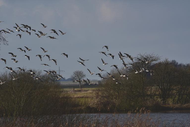 Keywords: flock of birds geese migratory birds swarm wild geese fly sky nature water bird animal feather wing plumage