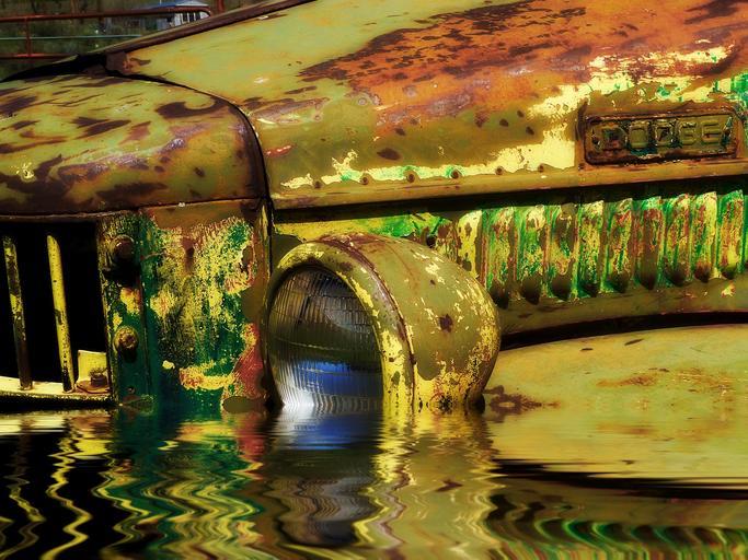 Keywords: flooded old rusty car truck vehicle old timer automobile vintage corrosion oldsmobile corrosives antique dodge transportation water flood mirroring reflection