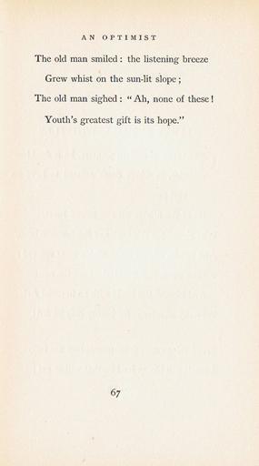| Keywords: Florence Earle Coates Mine and Thine 1904 067.jpg Florence Earle Coates Mine and Thine 1904 066 jpg Florence Earle Coates Mine and Thine 1904 068 jpg An Optimist; p 67 of Mine and Thine 1904 by Philadelphia poet Florence Earle Coates 1850-1927 First line O aged man pray if you know A scan of p 67 Florence Earle Coates 1904 None/copyright expired PD-old Florence Earle Coates Mine and Thine 1904 | ||||