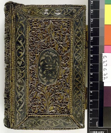 | Keywords: -Flosculi Historici delibati nunc delibatiores redditi, sive historia universalis usque ad Annum M.DC.LVI. Accessit editione huic chronologia principum, id est, series et successio Romanorum - Upper cover (c27c32).jpg Style Panel design Treasure binding; Caption Upper cover; Colour Grey; Edge Gilt exhibition history Decorative Technique Inlaid; Cover Material Silver Metal Niello black metallic alloy used as inlay on engr Bound in silver filigree over brass silver border and centrepieces 2 clasps hinging on upper cover Elaborate silver filagree covers over headbands Treasure binding ie cover probably made by metal worker not binder Probably German object history Text 1688; Cologne; Unspecified object type Cc-zero place of creation Binding Germany place of discovery Unspecified British Library image http //www bl uk/catalogues/bookbindings/LargeImage aspx RecordId 020-000008426 ImageId ImageId 43818 Copyright BL Flosculi Historici delibati nunc delibatiores redditi sive historia universalis usque ad Annum M DC LVI Accessit editione huic chronologia principum id est series et successio Romanorum Pontificum Imperatorum Electorum Editio quinta Cum appendice de rebus britannicis etc 2 pt Sumptibus H Demen Coloniae Agrippinae 1688 Uploaded with GWToolset Flosculi Historici delibati nunc delibatiores redditi sive historia universalis usque ad Annum M DC LVI Accessit editione huic chronologia principum id est series et successio Romanorum - Upper cover c27c32 http //www webarchive org uk/bldatasets/bindings/9048_4 jpg Bookbinding 17th-century bookbinding British Library Bookbindings |