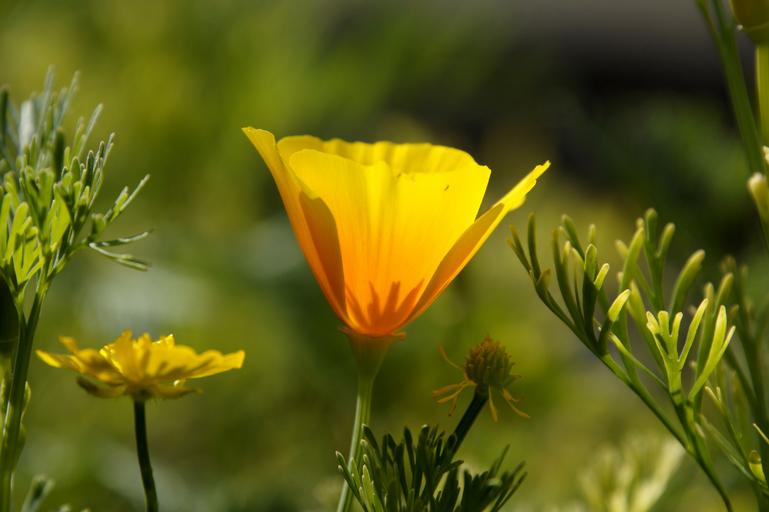 Keywords: flower garden nature sun yellow orange grass summer flowers petals flower garden light shadow transparency